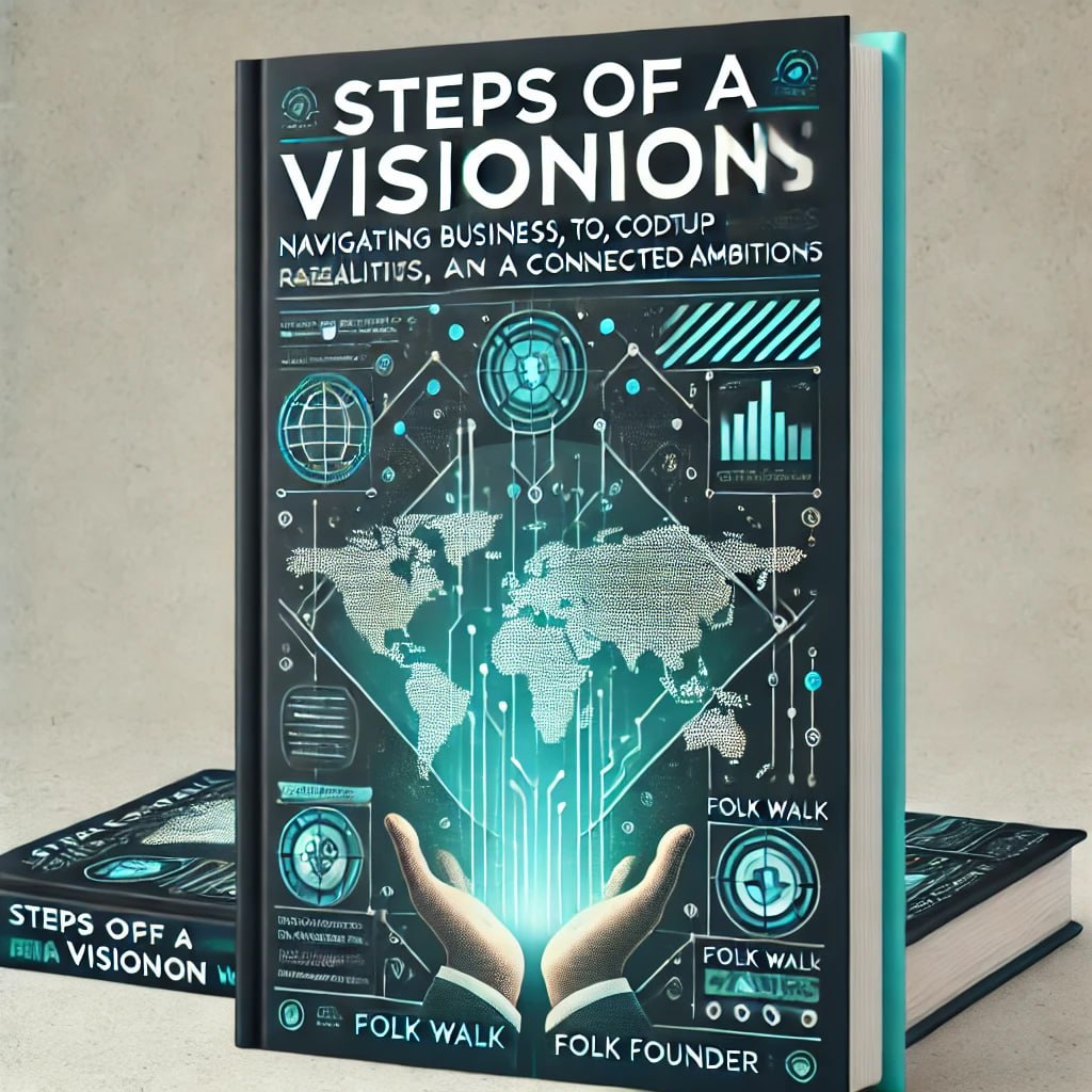 "Шаги визионера: Управляя бизнесом, кодом и глобальными амбициями. От мечты цифрового кочевника до стартап-реальности в связанном мире. Дизайн обложки отражает ваш предпринимательский и технологический путь, включая элементы глобальности и движения."