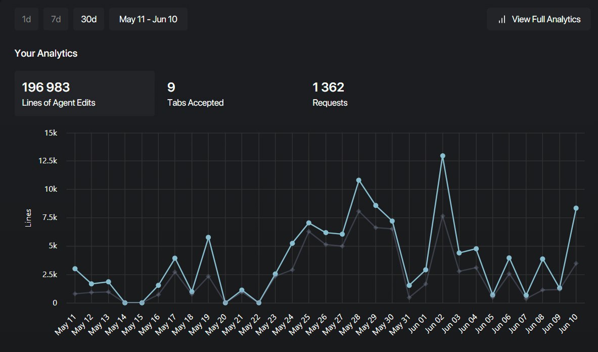 На графике — количество сгенерированных мною строк в cursor за последние 30 дней